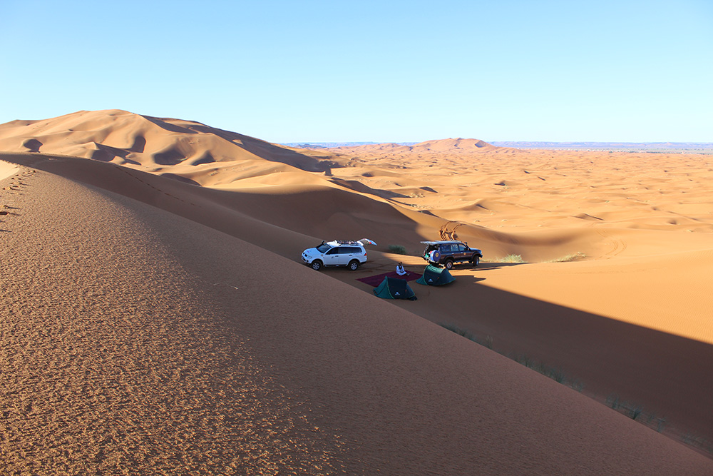 Départ l après midi en 4x4 vers un de nos Bivouacs privés après une 20 min de piste en 4x4 nous pénétrons les Dunes en 4x4 pour atteindre le Bivouac ; vous aurez suffisamment du temps pour admirer le coucher de soleil, dîner et nuit sous tentes Berbères. Le retour après avoir assister au lever de soleil et avoir pris le petit déjeuner.